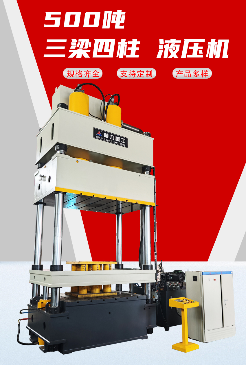 產品簡介:500噸四柱液壓機是一種具有廣泛應用范圍的機械設備,采用三梁四柱結構,PLC控制,以及整體式插裝閥集成系統,使得動作可靠,使用壽命長。