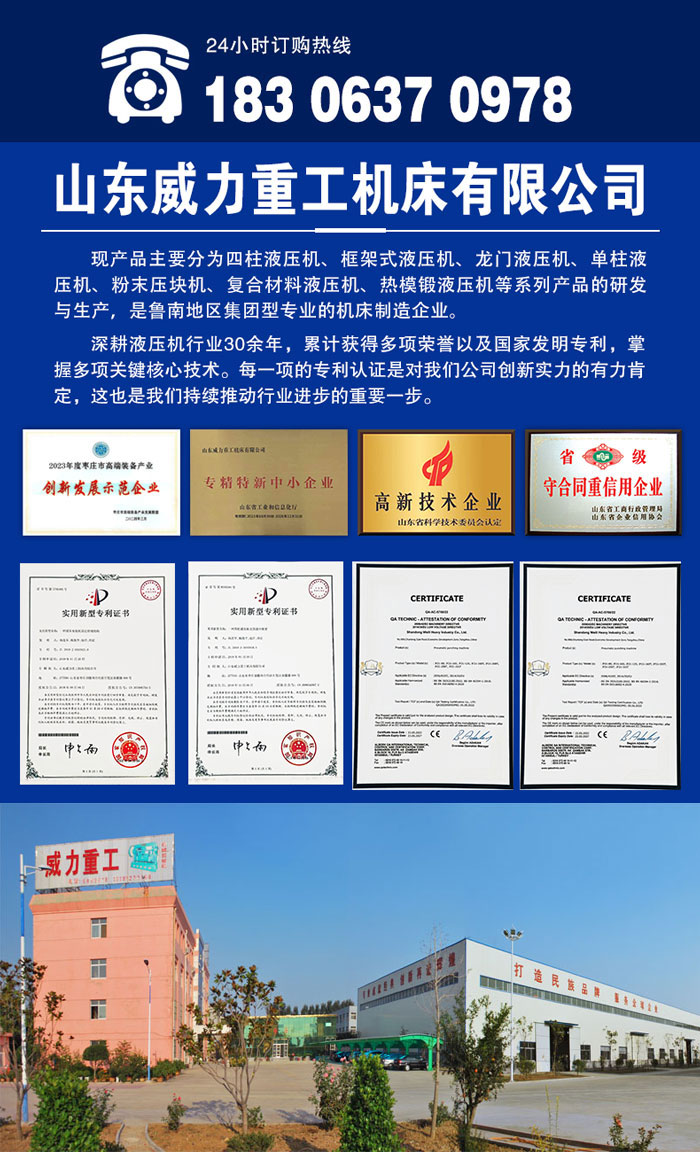 100噸四柱液壓機又名100噸四柱油壓機(100噸四柱壓力機),是山東威力重工的常賣機型,因其結構形式穩定嗎,適合多種產品的生產制造。100噸四柱液壓機適用于可塑性材料的壓制工藝,如沖壓、彎曲、翻邊、薄板拉伸等。也可從事于校正、壓裝、砂輪成型、冷擠金屬零件成型、塑料制品及粉末制品等壓制成型工藝。廠家直銷熱線:18306370978(同微信)